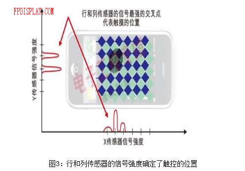 设计一个投影电容传感器阵列的目的是在同一时间使手指能够与多于一个的X传感器和一个以上的Y传感器发生作用(见图3)。这是的软件能够通过内插来非常精确地确定手指的具体位置。例如,如果传感器1,2,3感应出的信号强度分别为3,10和7,则手指的中心位置应该位于(1*3+2*10+7*3) / (3+10+7) = 2.2处。